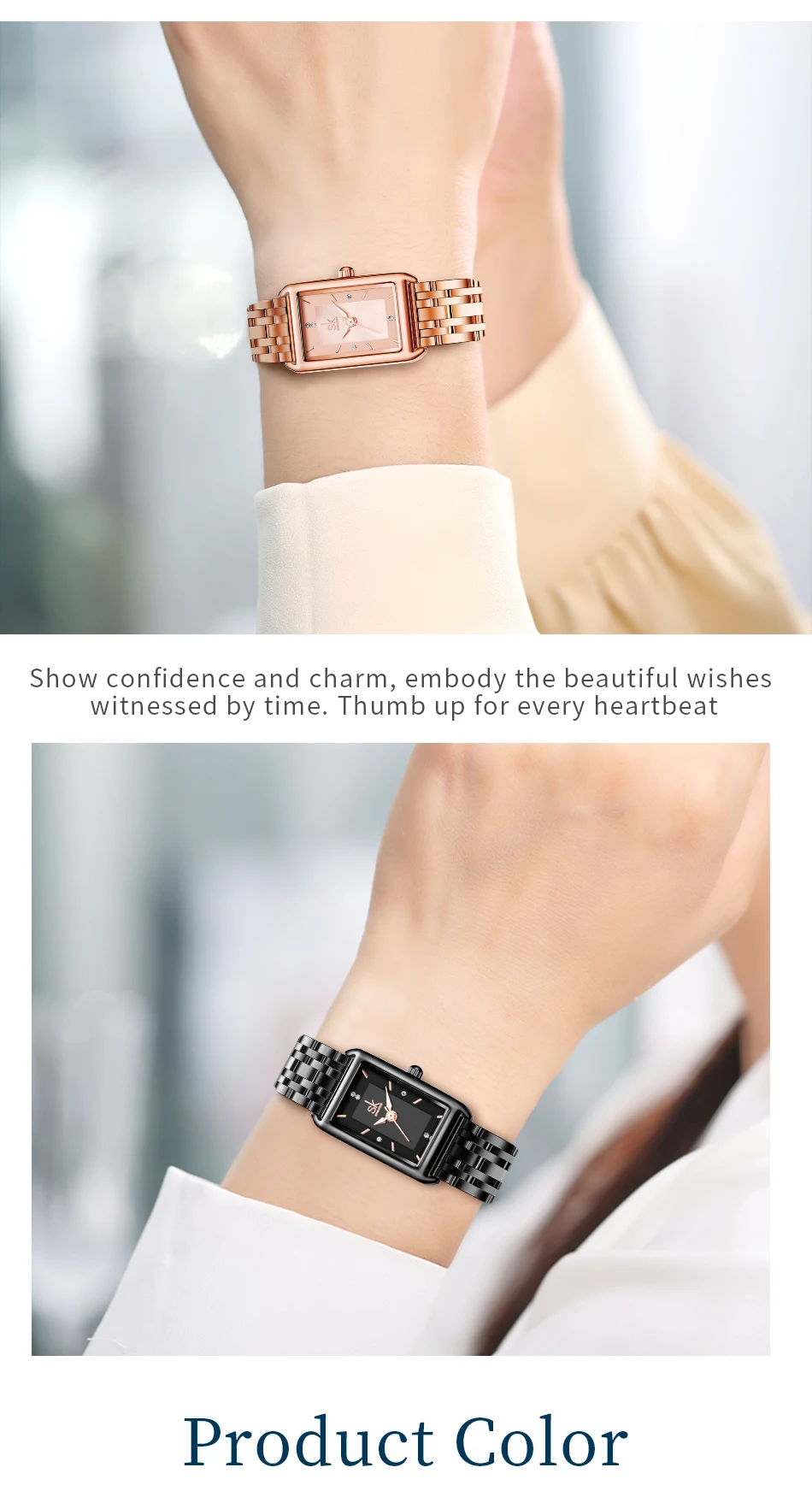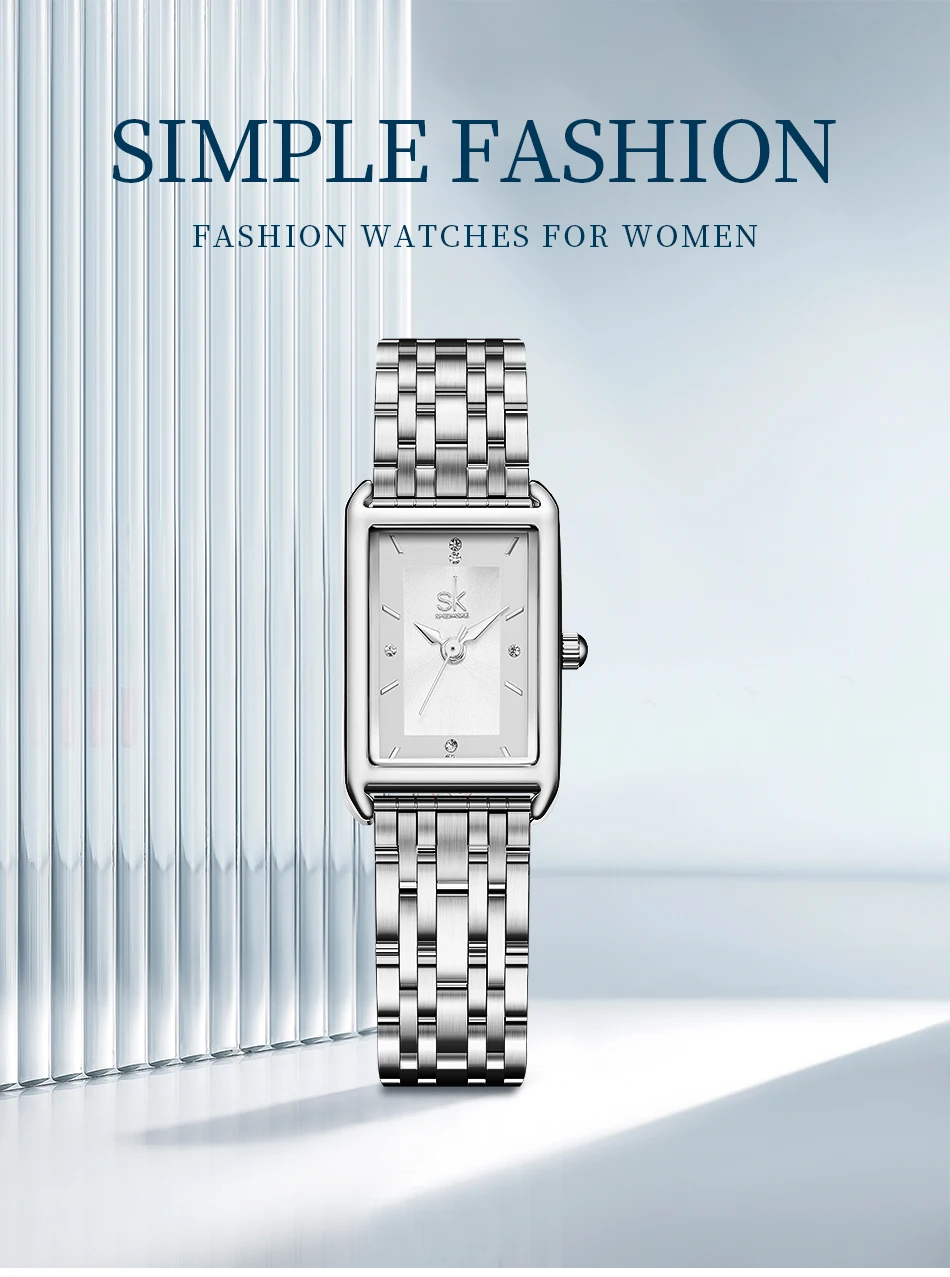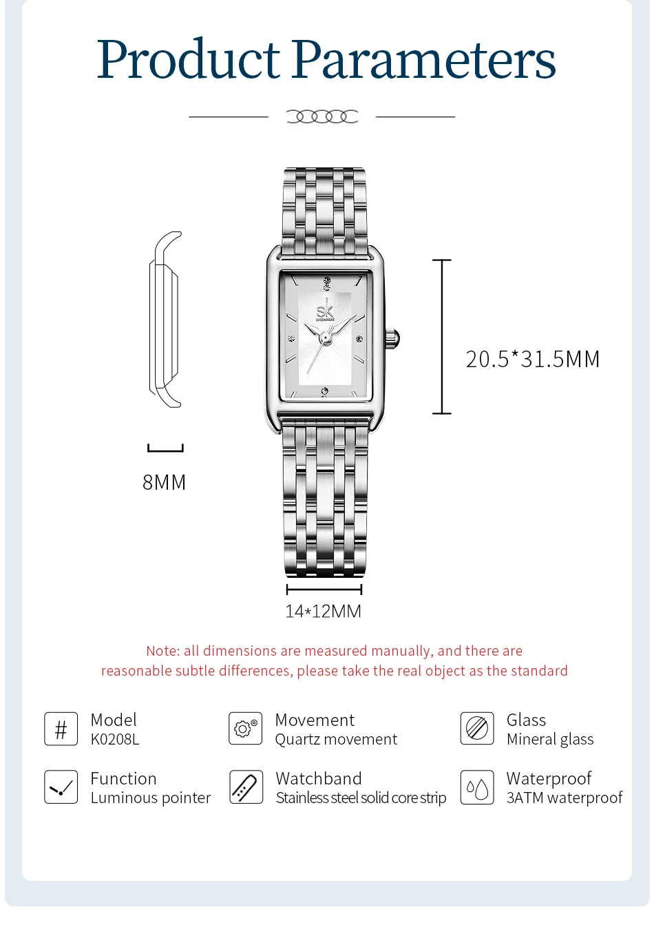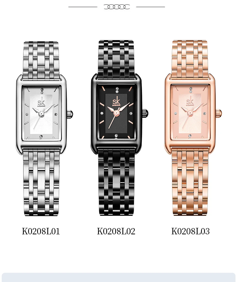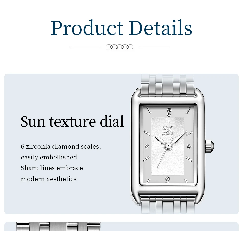 Skyla Élise erinnert an die diskrete Eleganz vergangener Jahrzehnte – neu interpretiert für die moderne Frau. Ihr rechteckiges Gehäuse und das fein geschliffene Edelstahlband verschmelzen zu einem Design, das zeitlos, edel und außergewöhnlich dezent wirkt.