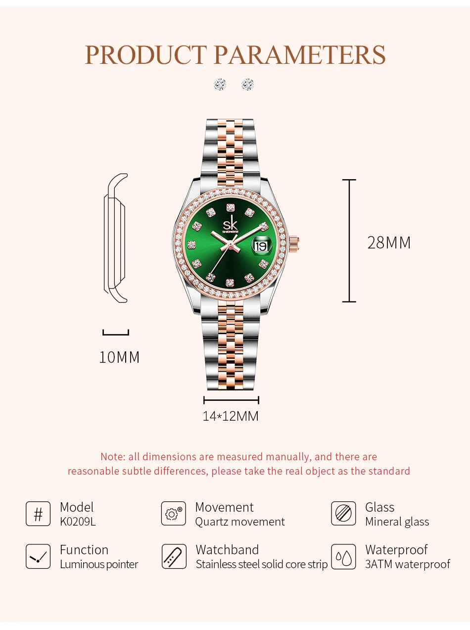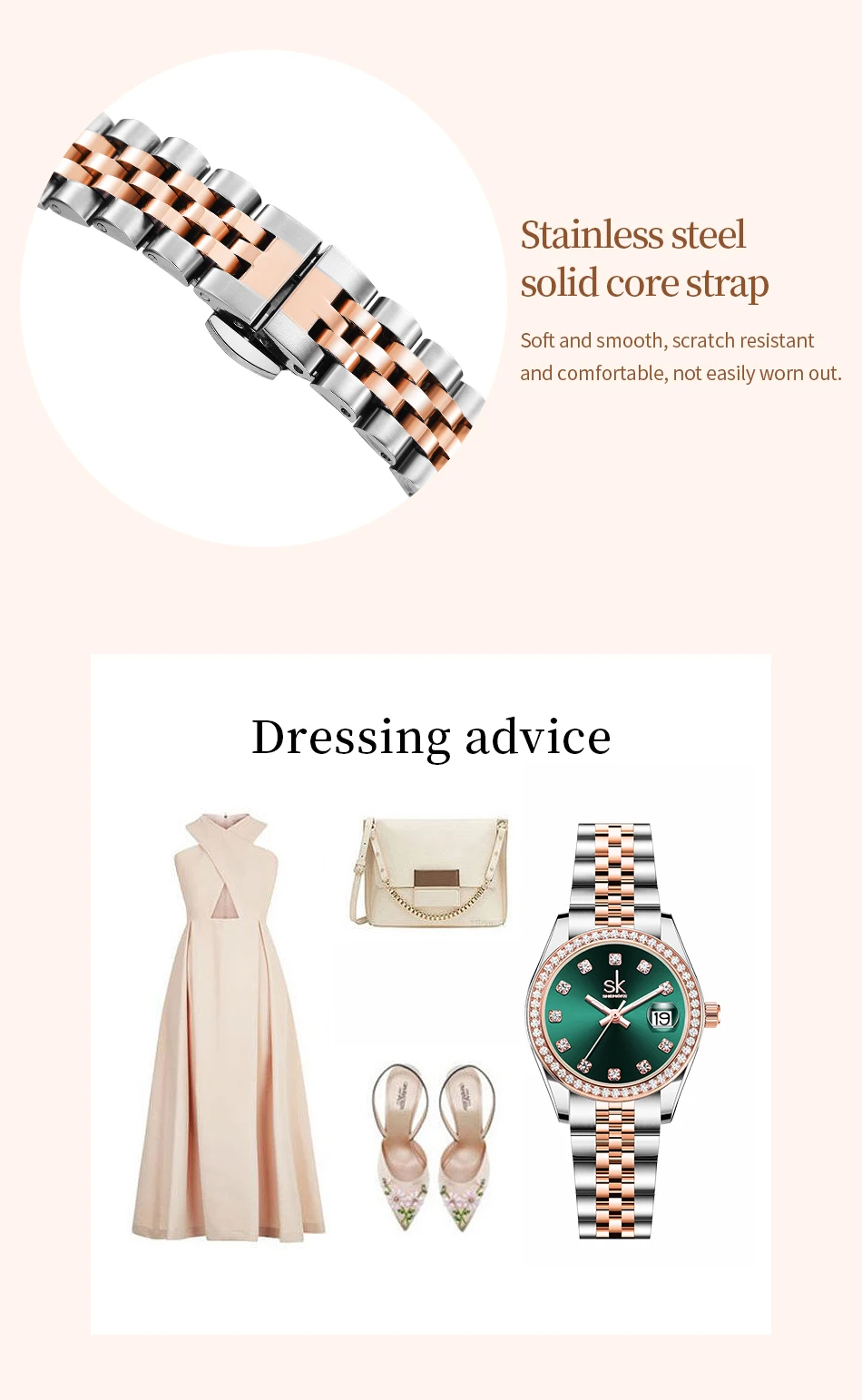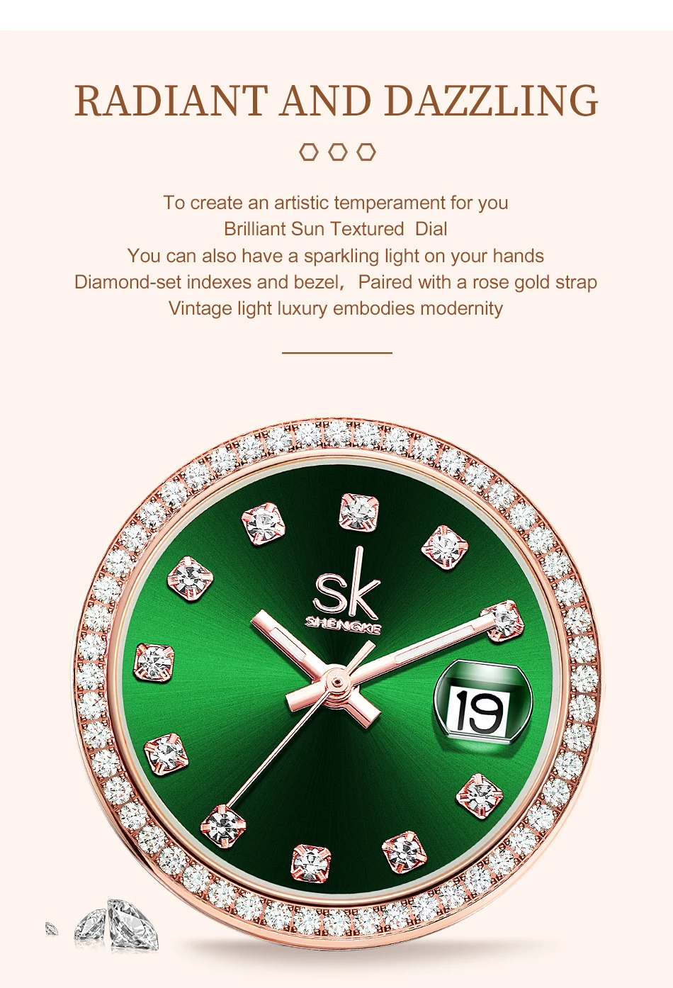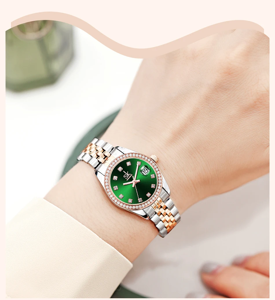 Die Skyla Vivre ist der Inbegriff moderner Opulenz: feminin, luxuriös und absolut ikonisch. Ihr rundes Gehäuse wird von einem fein gearbeiteten Edelstahlarmband eingefasst, während das schimmernde Zifferblatt mit leuchtenden Zeigern und elegantem Kalender-Detail sofort alle Blicke auf sich zieht.